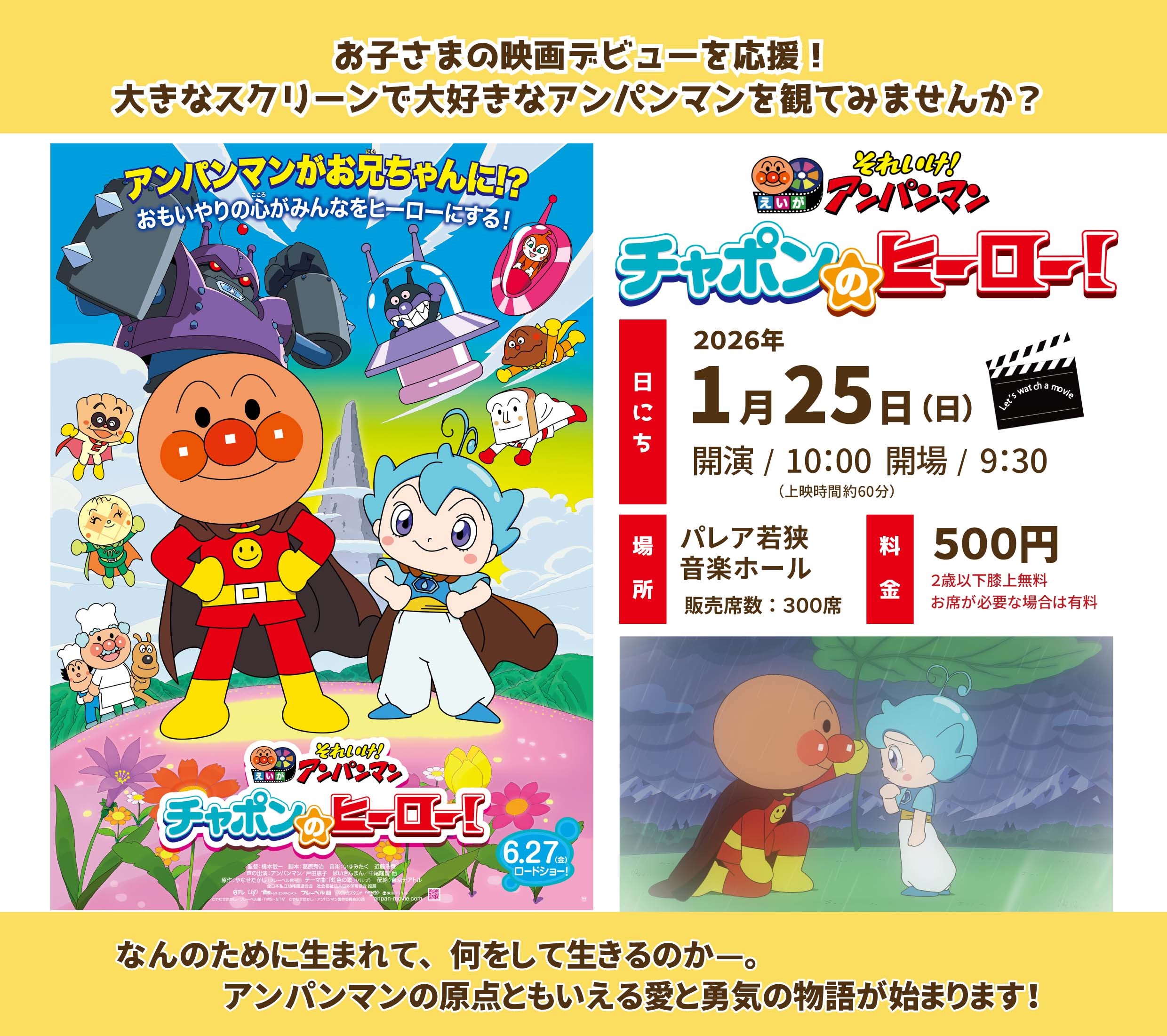いつものようにパトロールしていたアンパンマンは、空から落ちてきた不思議な男の子・チャポンと出会います。自分がどこから来たのかわからないチャポンは、アンパンマンたちと一緒に過ごすなかで、誰かを助け笑顔にする喜びを知り、「ヒーローになりたい!」と願い、アンパンマンを兄のように慕うようになります。しかし、チャポンの出生の秘密を知るばいきんまんが現れ、衝撃の事実を知ることに。涙の雨を降らすチャポンを優しく包み込むアンパンマン。「生まれた意味は自分で決める!」チャポンはみんなの笑顔のため、アンパンマンと一緒にばいきんまんに立ち向かうのでした・・・。