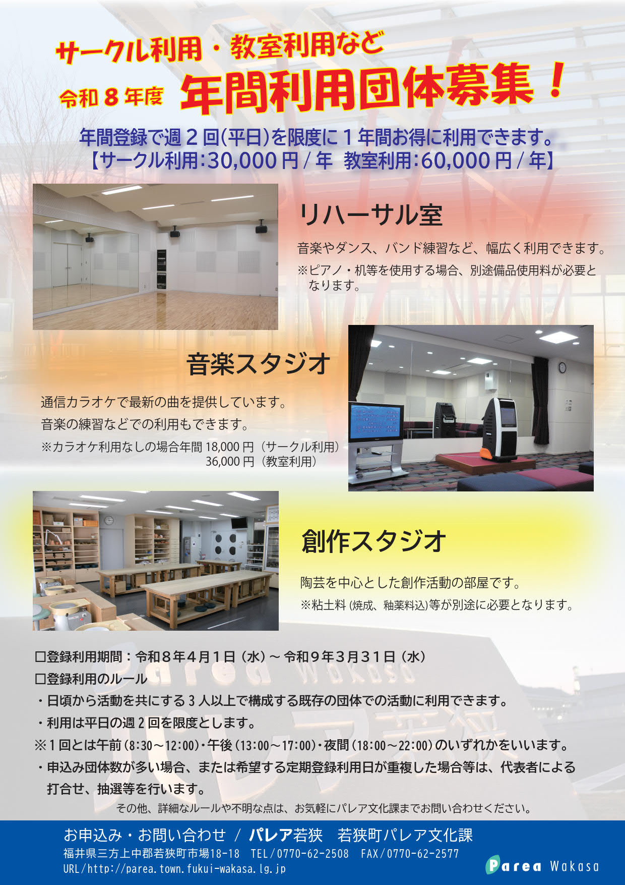 その他わからないことがあれば、パレア文化課 0770-62-2508 まで、お気軽にお尋ねください!